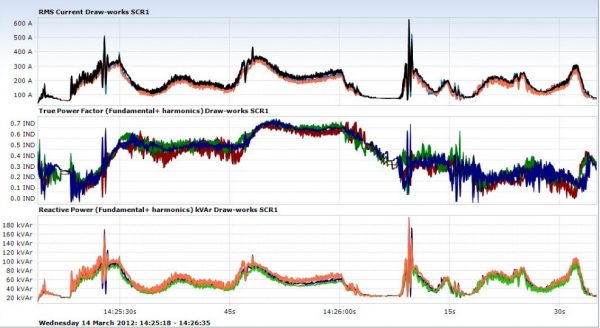 The trends below illustrate the rms current, power factor and reactive power demand (kVAr) for the SCR draw-works on a land-rig. As can be seen, the power factor reduces (and kVAr demand increases) during periods of increased current demand. The DPF and reactive power demands are dynamic and also dependent on the number of generators operating in parallel.