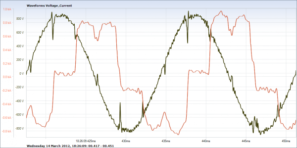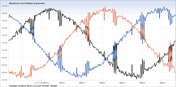 An example SCR drive derived repetitive voltage spikes is depicted below.