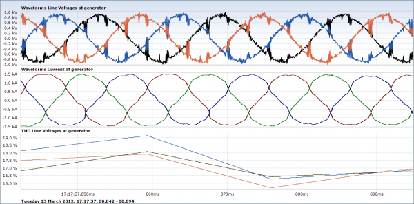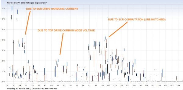 The figure below illustrates the voltage distortion a land-rig despite the load current being sinusoidal. The maximum total harmonic voltage distortion (THDu) show is 19.2%. The maximum THDu during the site visit was 26.3%. The THDu was due to the combination harmonic currents and line notching high frequency switching voltages.