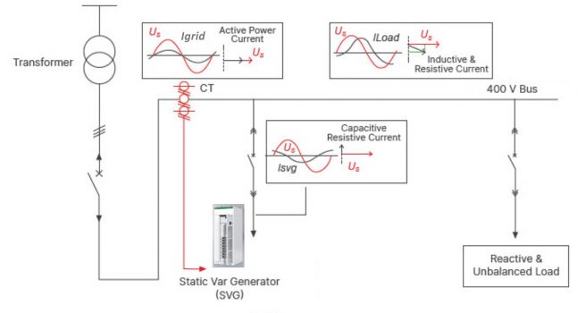 Static VAR generators SVGs) can be used to compensate for lagging and leading displacement powers factors. Their speed of response is significantly faster than contactor or SCR based traditional capacitor-based PFC systems.