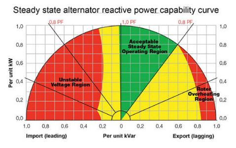 SVGs can be applied to utility-based power systems and generators. The typical generator capability curve is illustrated below. As can be observed, the generator’ unstable voltage region’ is clearly seen.